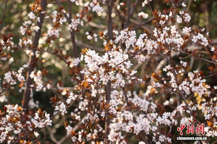 图为磨盘山丛林花园内乱怒放的紫叶李。 熊锦阳 摄