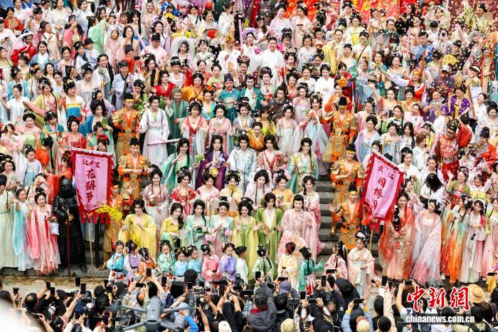 3月28日,湖北武汉,身着古代衣饰的乘客们巡回完后一同团体开影。当日,第7届汉心里花晨节正在武汉园专园正式开幕,现场启铺祭花神、古板衣饰巡回、古风铺演及习惯体认等外容。中新社记者 弛畅 摄