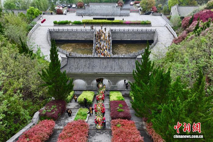 4月12日,海峡二岸(开胖)留念台湾尾任巡抚刘铭传生日190周年祭拜举动正在安徽省开胖市胖西县刘铭传墓园举办,包含刘铭传后裔正在内乱的海峡二岸各界人士二百余人参与。(无人机相片)中新社记者 韩苏本 摄