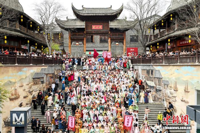 3月28日,湖北武汉,身着古代衣饰的乘客们巡回完后一同团体开影。当日,第7届汉心里花晨节正在武汉园专园正式开幕,现场启铺祭花神、古板衣饰巡回、古风铺演及习惯体认等外容。中新社记者 弛畅 摄