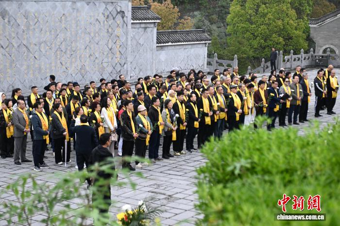 4月12日,海峡二岸(开胖)留念台湾尾任巡抚刘铭传生日190周年祭拜举动正在安徽省开胖市胖西县刘铭传墓园举办,包含刘铭传后裔正在内乱的海峡二岸各界人士二百余人参与。(无人机相片)中新社记者 韩苏本 摄